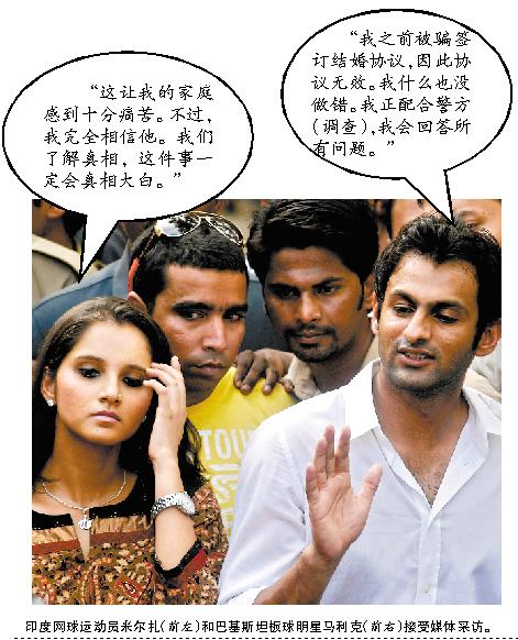 巴基斯坦板球明星舒艾卜·馬利克與印度知名網球運動員薩妮亞·米爾扎定于本月成婚,但婚禮前夕橫生枝節。印度警方5日沒收馬利克護照,禁止他離境,原因是另一名印度女子自稱已于2002年與馬利克結婚。