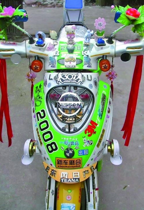 這輛電瓶車不得了,看車頭:寶馬、標致、日產、東風各種標致全貼上了,還有可愛的helllo kitty 、snoopy等小掛飾,更加“致命”的是兩個反光鏡上還綁著兩朵大紅塑料花,就一輛電瓶車而言,可謂“風騷”到了極點。