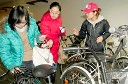 在服務項目的啟動儀式上,14名分別來自中國、越南和印度尼西亞的留學生來到活動現場。平和文化中心的工作人員們在啟動儀式上搞了個別出心裁的游戲,特意請這些留學生們從事先準備好的30輛自行車中,分別按照型號和顏色各選出一輛最受歡迎的車。