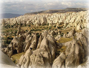 卡帕多奇亞位于土耳其安那托利亞(Anatolia)的腹地,在歷史上有很長(zhǎng)一段時(shí)間與世隔絕,不通音信。在這里,自然的偉大力量鍛造出了世上獨(dú)一無(wú)二的神奇地貌。這種地貌的形成起源于幾百萬(wàn)年前Erciyes、Hasandag和Golludag三座火山的噴發(fā)。噴出的大量巖漿冷卻、鈣化,凝固成的風(fēng)化巖層具有良好的可塑性,易于受腐蝕。之后,較耐腐蝕的玄武質(zhì)火山巖覆蓋了松軟的風(fēng)化巖層。隨著時(shí)光的流逝,玄武質(zhì)巖石碎裂,變得疏松,將松軟的風(fēng)化巖重又暴露出來(lái)。慢慢地,除了被玄武巖象傘一樣遮蓋起來(lái)的地方外,雨水把風(fēng)化巖石侵蝕出一條條溝壑,形成了陡峭的神奇煙囪景觀(fairy chimneys)。