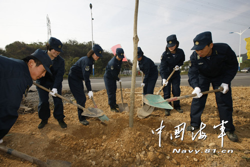 11月6日,東海艦隊(duì)某水警區(qū)20名官兵來到駐地經(jīng)濟(jì)開發(fā)區(qū)開展軍民秋季綠化植樹活動(dòng)。寒風(fēng)中官兵們奮戰(zhàn)半個(gè)多小時(shí),300顆左右的樹木挺立在荒蕪的土地上,頓時(shí)變得生機(jī)盎然起來。拍下身上的塵土,大家紛紛表示能在喜迎黨的十八大之際,為建設(shè)第二故鄉(xiāng)貢獻(xiàn)力量,很開心。