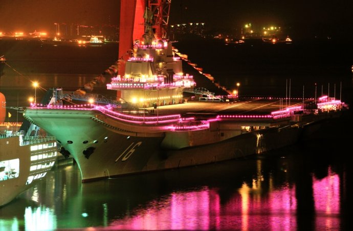 “遼寧艦”節(jié)日期間霓虹燈閃亮裝點海灣