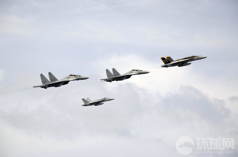 馬來西亞海軍的蘇-30戰機與美國海軍的F/A-18戰斗機組成編隊從華盛頓號航母上空飛過