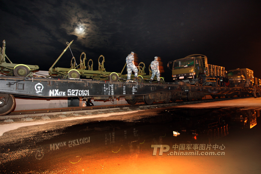 空軍戰斗群地轉人員,在黑水火車站冒雨進行裝備重組,并對其備進行加固。 曹占禮 攝