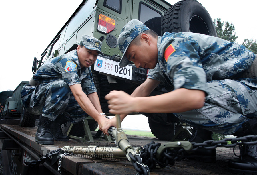 空軍戰斗群地轉人員在中轉途中加固裝備。曹占禮 攝