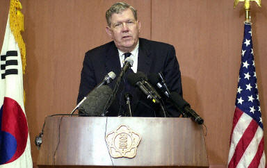 據“中央社”報道,凱利以美國布什總統的特使身份訪問漢城,在會見韓國總統當選人盧武鉉之后,在漢城外交部舉行新聞發布會。