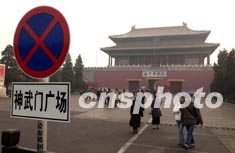 一月十五日,北京故宮神武門廣場豎起禁止停車的交通標志牌。為恢復紫禁城周邊凝重幽靜的歷史原貌,故宮博物院決定從當天開始廢止神武門外停車場。作者:張煒