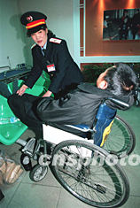 北京站在春運(yùn)期間,開辟了全國第一家敬老助殘候車室,免費(fèi)幫助老弱病殘旅客乘車。