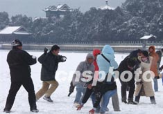 北京一月十八日清晨被小雪披上銀裝,一群年青人歡聚昔日皇家園林,展開一場男女雪戰,好不快活。作者:賈國榮