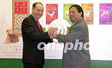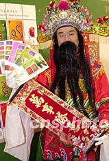 香港郵政署1月19日發行十二生肖(羊年)特別郵票,郵政署邀請財神展示羊年特別郵票首日封,并祝市民萬事勝意。鄧慶樂 攝