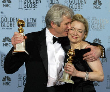 圖為李察·吉爾(左)和芮妮·齊維格(右)分別獲得音樂(lè)喜劇類電影最佳男、女主角獎(jiǎng)。
