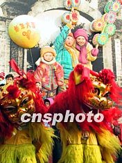中國春節農歷大年初一,北京傳統的廠甸廟會當街表演“三獅滾繡球”,大獲喝彩。