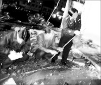 公安人員在現場檢查殘留煙花進行取證。景小華攝