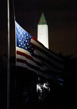 美國東部時間2月1日上午9:00(北京時間1日晚10:00),就在“哥倫比亞”號航天飛機即將返回佛羅里達州的肯尼迪航空中心前數分鐘,該飛船突然發生分裂解體現象,有碎片從飛船上落下。機上7名宇航員沒有生還的跡象。圖為:美國華盛頓降半旗紀念哥倫比亞號失事宇航員。