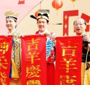 據(jù)臺(tái)灣媒體報(bào)道,胡志強(qiáng)是7日上午與國(guó)民黨另兩位“政治明星”臺(tái)北市長(zhǎng)馬英九、桃園縣長(zhǎng)朱立倫一同在桃園為元宵燈會(huì)造勢(shì)。朱、馬、胡三人以福、祿、壽三星造型粉墨登場(chǎng)。