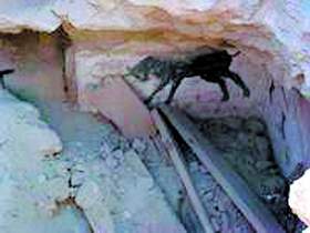 在盜墓現場,先見到幾座挖開的古墓,棺材板扔得到處都是,尸骨遍地。后是一座精美絕倫的古墓,它的位置很高,在一個高高的佛塔正下方。盜墓人從正上方打開洞進入了墓室,墓室共有兩個,第一個墓室內有5具棺材,已經被盜墓人破壞,滿地都是碎成一塊一塊的干尸、枯骨和絲綢殘片。最讓他們感到吃驚的是墓室墻上的壁畫,一峰金駝和一峰銀駝相互撕咬著,一個穿長袍模樣的人站在中間,打手勢讓兩駝分開;旁邊一頭奔牛怒目而視,振蹄欲奔。可惜此壁畫已被破壞,一具干尸躺在壁畫下。第二個墓室有4具彩棺被劈開,干尸及綢緞碎片扔得滿地都是。彩棺的顏色非常華麗。壁畫上一大群大臣模樣的人正在行禮,模樣栩栩如生。可惜此壁畫也被損壞了。