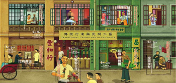 該套郵票描繪六種傳統(tǒng)行業(yè)與民間工藝,包括代寫書信、制造雀籠、縫制旗袍、梳頭美發(fā)、捏面粉公仔及叫賣“飛機(jī)欖”。
