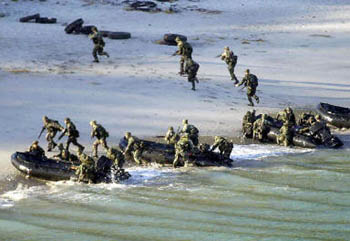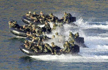 為鏟除阿布沙耶夫恐怖組織,美海軍陸戰隊18日在馬尼拉以南島嶼與菲律賓軍隊舉行聯合軍事演習。圖為:美海軍陸戰隊西棲搶灘登陸。