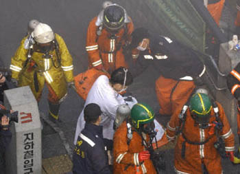 圖:韓國救援人員搶救地鐵縱火案傷員