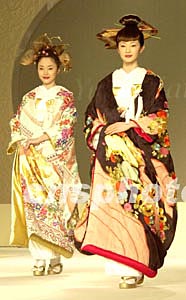 日本著名時裝設計師桂由美(Yumi Katsura)十八日在東京展示了她的最新作品。日本和服以穿著復雜、行動困難而著稱,而桂由美在保持傳統美的基礎上,對和服進行“易穿、易動、輕量”等時裝化改良。作者:陶光雄