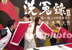 劇中藝員歐錦棠、滕麗名、佘詩曼、歐陽震華(左起)于會(huì)上以口代手寫上"冤"字比拼,場(chǎng)面搞笑。