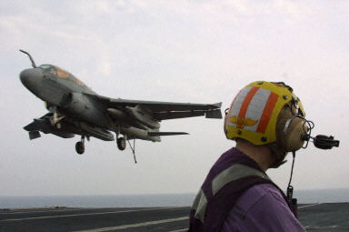 圖為:為推翻伊拉克薩達姆政權,美國防部派往阿拉伯海的美國“尼米茲”級核動力航空母航“林肯”號,EA-6B"徘徊者"電子作戰機進行常規訓練任務,準備降落航空母艦(1)