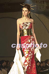 日本著名時(shí)裝設(shè)計(jì)師桂由美(Yumi Katsura)結(jié)合日本傳統(tǒng)和服的美感,創(chuàng)作出新穎的時(shí)裝。圖為桂由美新春在東京展示的一款紅色晚禮服,它由白色的和式禮服魔術(shù)般地變化而來,依然保留著和服束身的風(fēng)格與美感。陶光雄 攝