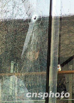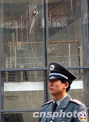 北京大學(xué)農(nóng)園餐廳二月二十五日發(fā)生自制黑火藥爆炸事故。圖為保安在餐廳被爆裂的玻璃前執(zhí)勤。作者:武仲林