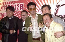 香港著名音樂人黃沾2月25日舉行《黃沾「獅子山下」演唱會(huì)》記者會(huì),曾志偉、鄭少秋、鍾鎮(zhèn)濤、陳百祥(右起)上臺(tái)與黃沾祝酒。鄧慶樂 攝