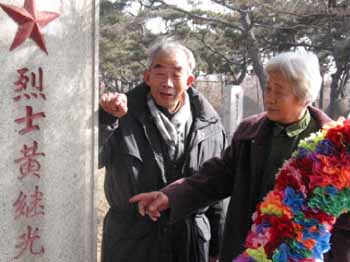 得知王清珍來沈后,黃繼光生前所在連的指導員鐘仁杰老人喜出望外,他和王清珍一起來到黃繼光的墓前,敬獻了花圈。兩位老人在一起回憶了許多過去的歲月,并參觀了紀念館。(葛紅俠)