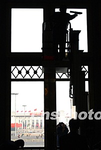第十屆全國人大和政協盛會即將開幕,工作人員正在清洗北京人民大會堂東大門玻璃,準備以潔凈亮麗的形象迎接盛會召開。作者:張煒