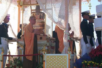 今天早上,泰國(guó)曼谷空軍機(jī)場(chǎng)舉行了隆重的送歸儀式。泰國(guó)文化部長(zhǎng)烏萊婉致詞,她以泰國(guó)政府、佛教界和全國(guó)人民的名義,衷心感謝中國(guó)政府為慶祝泰國(guó)國(guó)王陛下75圣壽大吉,同意佛牙舍利自2002年12月15日至2003年2月28日共76天,赴泰佛統(tǒng)府佛教城臨時(shí)供奉76天。她說,供奉期間,泰國(guó)人民前往佛教城舉行各種各樣的參拜活動(dòng)。泰國(guó)王儲(chǔ)殿下于1月9日代表國(guó)王陛下前往參拜,泰國(guó)佛教最高領(lǐng)袖僧王兩次參拜,泰國(guó)樞密院主席、國(guó)會(huì)主席、上議院主席、內(nèi)閣主要領(lǐng)導(dǎo)人以及眾多議員都前往參拜。在佛牙舍利臨時(shí)赴泰供奉事宜圓滿成功之際,泰國(guó)政府對(duì)中國(guó)政府和人民以及中國(guó)佛教協(xié)會(huì)表示衷心的感謝,并祝愿泰中友好萬古長(zhǎng)青。