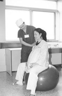 她感覺(jué)最有意思的鎮(zhèn)痛措施是:在兩次陣痛之間騎坐在分娩球椅上。分娩球是一個(gè)直徑1米的彩色充氣橡膠球,固定在有扶手的坐椅上,在規(guī)律宮縮的間歇騎坐上去,可以達(dá)到放松盆底肌肉的目的。她坐了一會(huì)兒,果然感到柔軟舒適,疼痛減輕。”