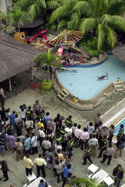 酒店保安監(jiān)督穆哈迪相信﹐該直升機在21樓停機坪著陸時﹐突遇一陣強風﹐被吹落樓頂。直升機墜落在兒童泳池旁邊及三樓平臺一家露天酒吧﹐部分殘骸散落池中。直升機支離破碎,但未起火。