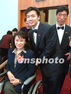 全國政協委員張海迪五日列席十屆全國人大一次會議開幕會,年輕的大會執勤人員爭相與這位身殘志堅的“青年楷模”合影。作者:張煒