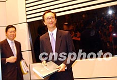 香港特區(qū)政府3月5日公布備受關(guān)注的香港2003至2004年度財政預算案,財政司司長梁錦松與財經(jīng)事務及庫務局局長馬時亨出席記者會,回答有關(guān)預算案問題。 洪少葵 攝