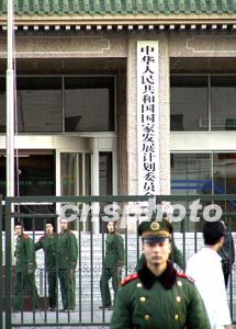 備受各界關注的國務院機構改革方案六日上午提請十屆全國人大一次會議審議。根據這一方案,國家發展計劃委員會將改組為國家發展和改革委員會,以完善宏觀調控體系。圖為武警戰士三月在國家計委前執勤。作者:羅杰