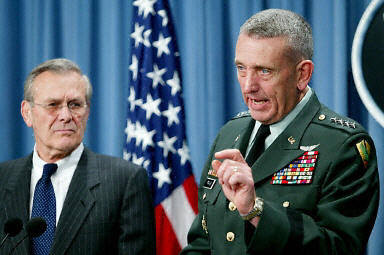 3月5日,在美國華盛頓五角大樓,美國國防部長拉姆斯菲爾德(左)和美國中央司令部司令弗蘭克斯出席記者招待會。弗蘭克斯說,美軍目前已經為對伊拉克采取軍事行動作好了準備。