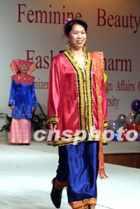 十二日,美、英、法等22國(guó)駐滬領(lǐng)事夫人們齊聚東華大學(xué),參加主題為“女性之美,服裝之魅”文化交流活動(dòng)。活動(dòng)中領(lǐng)事夫人們還興致勃勃的走上T臺(tái)展示各自獨(dú)具魅力的民族服飾。圖為領(lǐng)事夫人們?cè)谡故久褡宸棥W髡?湯彥俊