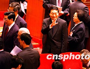朱鎔基總理三月十四日在北京人民大會堂出席十屆全國政協一次會議閉幕式,最后離場時俯身抱拳向委員們祝福。