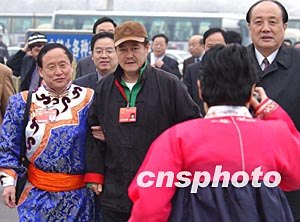 全國人大代表趙本山三月十五日前往北京人民大會堂參加十屆人大一次會議的選舉,一邊走一邊應(yīng)其他代表的請求合影。作者:賈國榮
