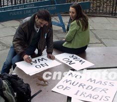 三月十七日在聯合國安理會為避免戰爭竭盡所能之時,守候在聯合國大樓外的反戰者書寫反戰標語,為阻止戰爭做最后努力。作者:趙海燕