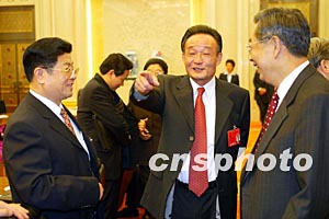 十屆人大常委會十八日下午舉行第一次委員長會議,吳邦國委員長主持會議。圖為吳邦國委員長與王兆國、許嘉璐副委員長一起交談。作者:毛建軍