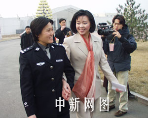 上午十時左右,身著米色套裙、白色皮鞋的滕春燕從位于北京大興的一所監獄中走出來的時侯,與緊隨其后的兩位女警員相擁告別。面對早已等候在大門外的十多位中外記者,滕春燕興奮地說:“我現在的心情非常好。”為接女兒出獄,滕春燕的父親滕玉本專程自外地來到北京。