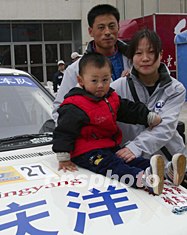 北京慶洋拉力車隊車手陳德安駕駛捷達GTX賽車,參加2003年中國汽車拉力賽上海站比賽。在22日發車儀式前,特意從北京趕來的妻子與兩歲的兒子前來助陣,期望取得好成績。作者:趙振清
