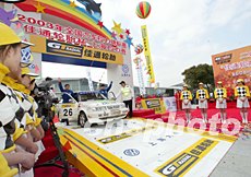 中國臺北車手林志穎作為佳通輪胎形象代言人,參加2003年中國汽車拉力賽上海站比賽。在22日發車儀式上,由上海靚女陪伴準備發車。作者:趙振清