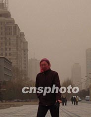 二十六日上午,長春市還是陽光明媚,下午忽然“天公變臉”。市區天空一片暗黃,路人不得不用口罩、帽子、紗巾等將頭部“武裝”起來,在風沙中低頭疾行。作者:韓丹