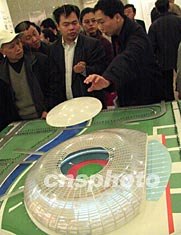 2008年北京奧運會主體育場——國家體育場設(shè)計方案三月底在北京向公眾展示,三個方案成為最終的候選方案。圖為由日本設(shè)計機構(gòu)與中國清華大學(xué)建筑設(shè)計研究院合作推出的候選方案。作者:武仲林