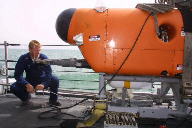 30日,美軍艦“掠奪”號使用水雷壓制裝置在伊拉克南部烏姆蓋斯爾水域執行掃雷任務。