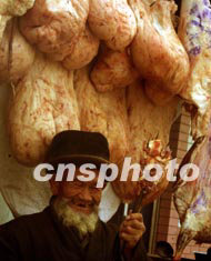 一位賣肉的維吾爾族老漢日前在新疆喀什街頭熱情地張羅生意。春季的維族聚集城市喀什,市場一派繁榮。作者:宋吉河
